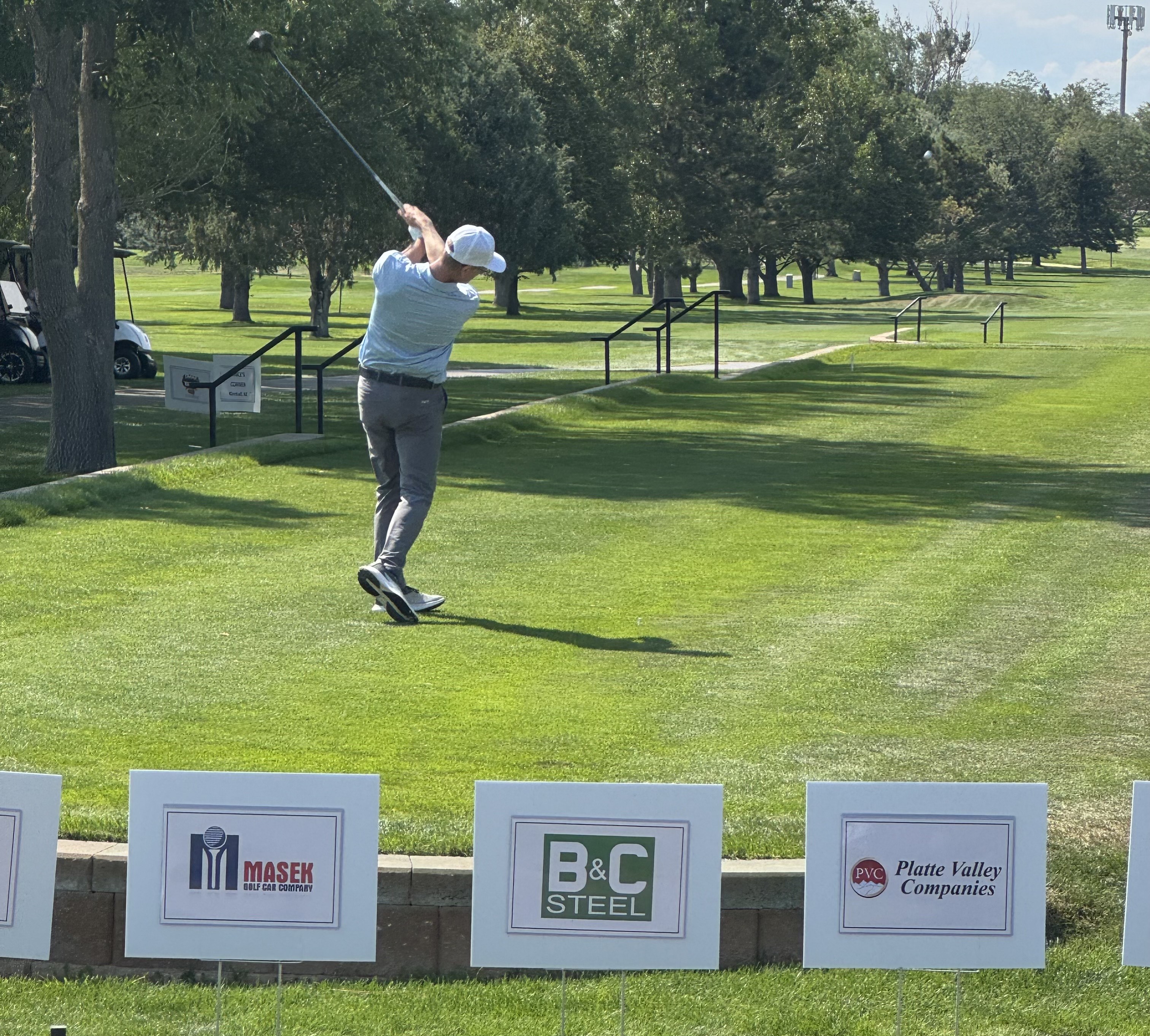 Back in Scottsbluff, Jhared and I teed off on the opening 520-yard par-5 playoff hole. Altitude, heat, and adrenaline carried my tee shot down the fairway so far the ball refused to come down. “I’ll see you in two shots,” Jhared said with a laugh. He had a hybrid into the green; I had 126 yards left to the middle.