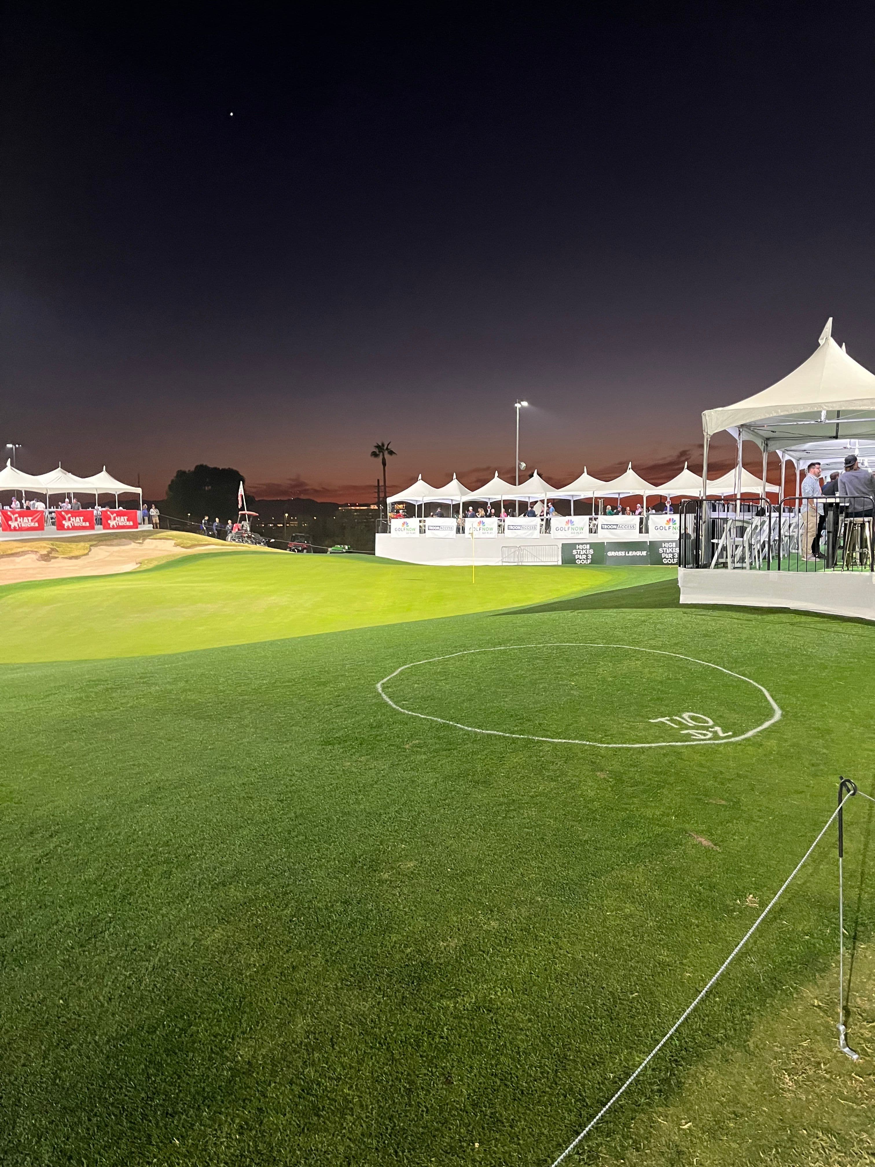 The event setup was impressive: hospitality tents constructed around multiple strategic points on the golf course, a central food truck area, a main concert area with the event live-streaming and a band playing, and alcohol never more than a short wedge shot away. Music blared from various speakers around the course. The live band played on a stage around the clubhouse, away from the on-course action. A solo guitar player strummed some cover songs behind the 18th green.