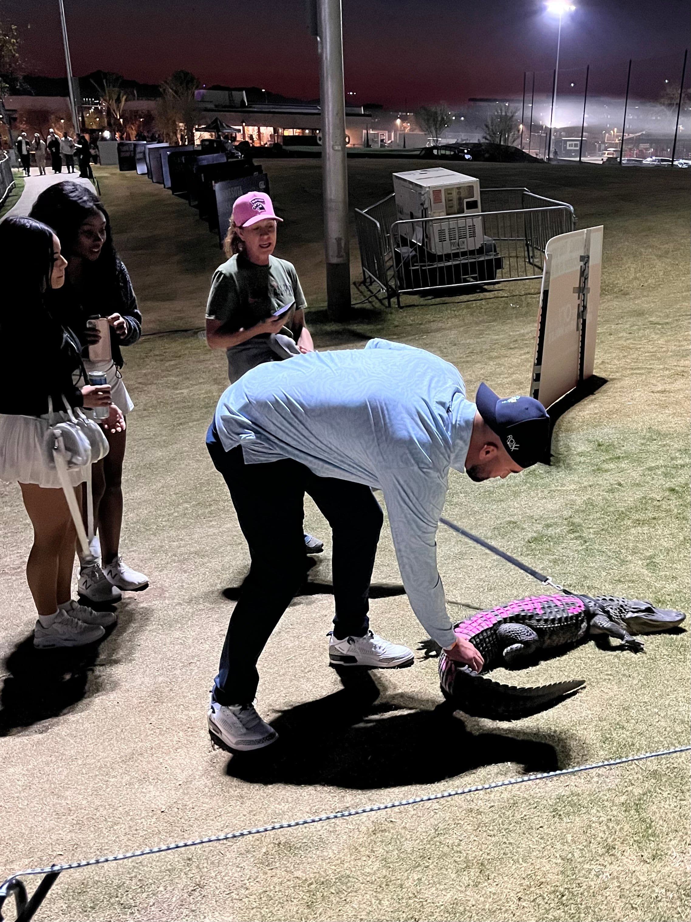 Standing next to the 10th tee at Grass Clippings Rolling Hills in Tempe, Ariz., I watched the New York Blue Birds, the Michigan Auto Aces, and the Los Angeles Roses under the lights. With a dozen or so onlookers, and surrounded by LED lights, I was flanked by a mule with an adult beverage sack slung over its back on one side, and a live alligator on a leash with the team name “Swamp Dawgs” written in pink on its back. A cop approached the tee, and while I expected him to at least show some interest in the dinosaur being pulled around the desert on this cool night, he was only interested in watching golf.