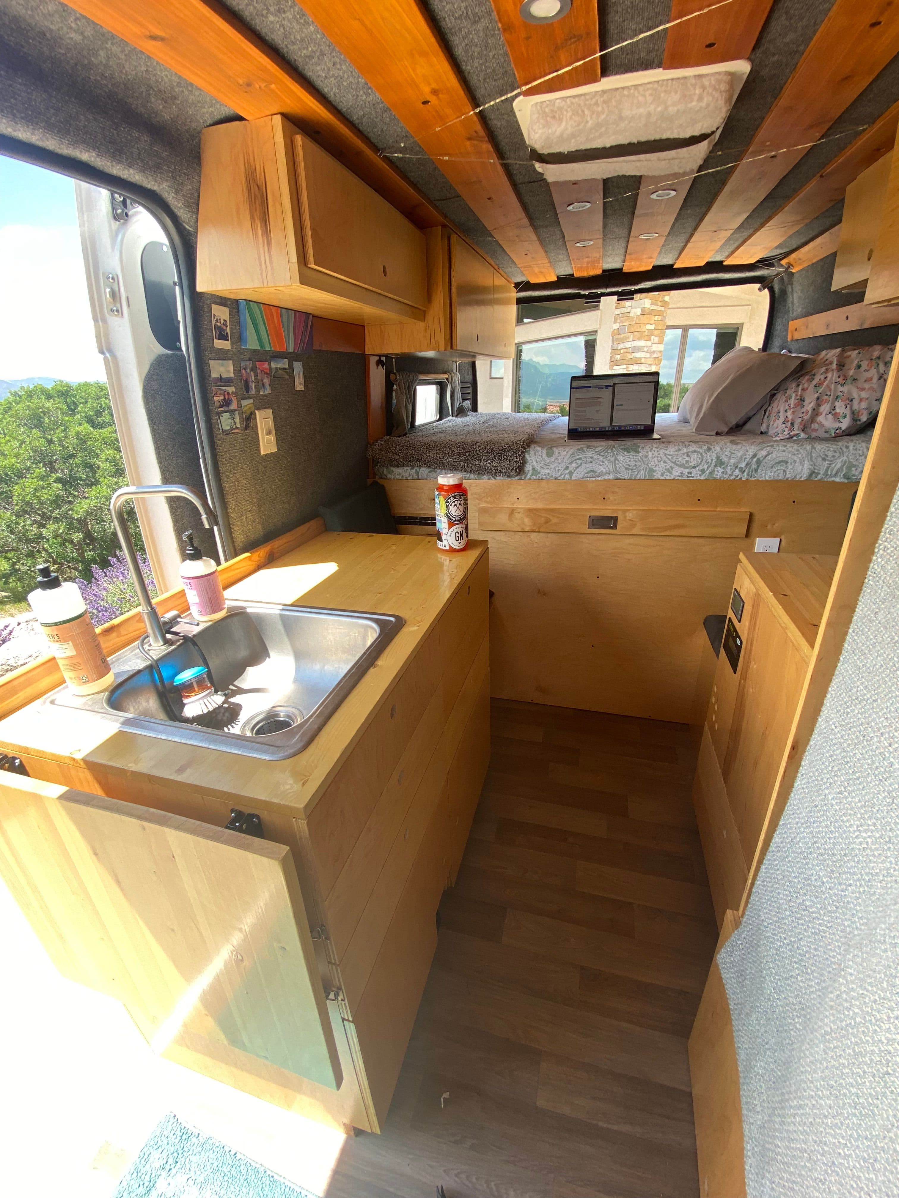 Crawford and McCutcheon have been living in the 2018 Ram Promaster 2500 van they lovingly call ‘Solstice’ so Crawford can continue chasing her dream of playing on the LPGA Tour. Solstice is a sleeper van larger than a minivan and smaller than a traditional RV. The inside is cozy, with a small kitchen and full-size bed platform in the back. Dimmable canister lights are set into decorative wooden ceiling slats and set the mood over a working sink, built-in cabinets, a pull-out dining table and closet. A well-used portable camping stove resides in a drawer under a small refrigerator. It’s welcoming, it’s bright, it’s home.