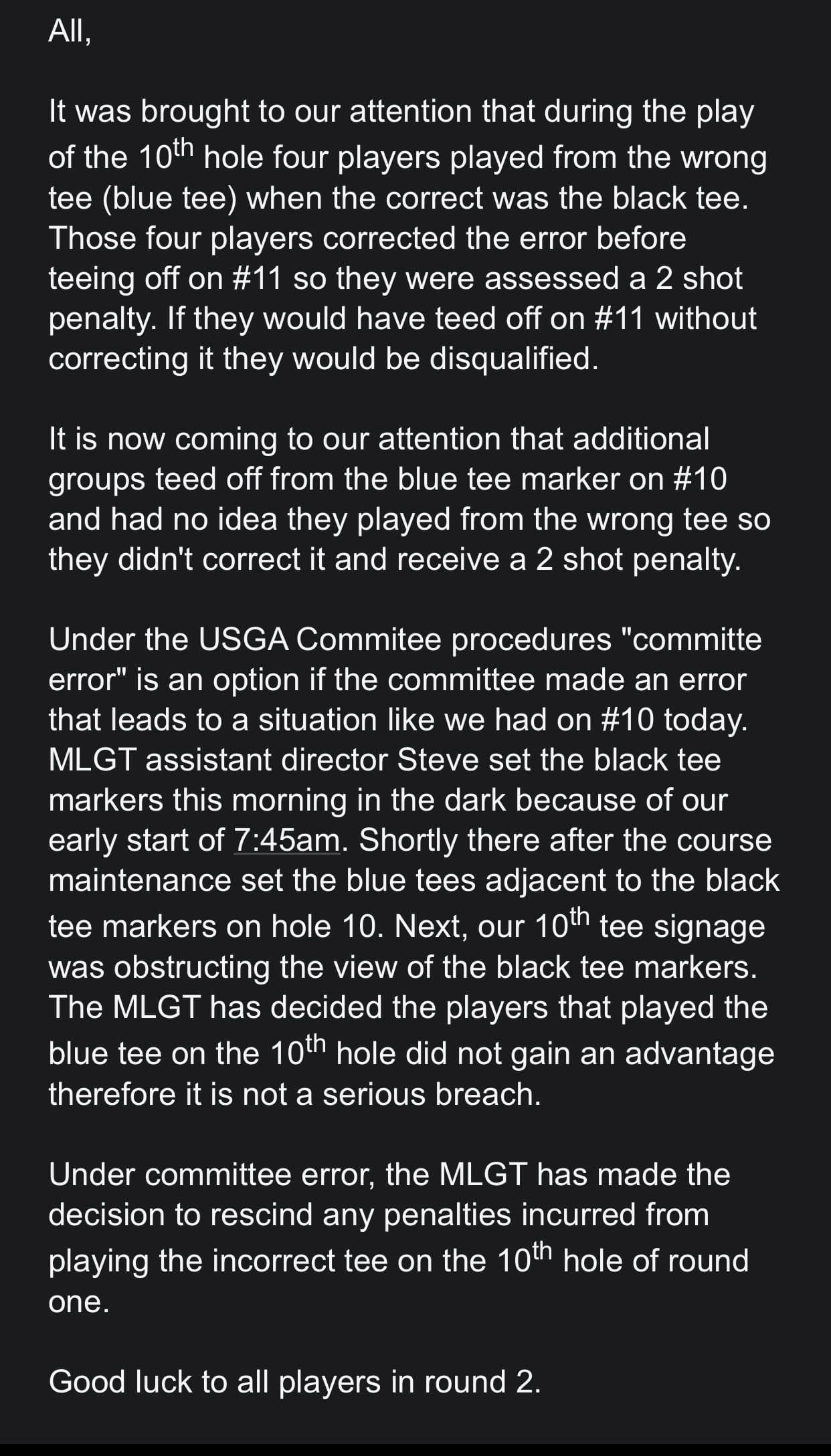 After the first round was completed, it was brought to Turner's attention that at least one other group had played from the incorrect tee, and it became clear there were likely many more. This put Turner in a tough position. He realized he may need to identify every player who played the wrong tee and disqualify them. One problem with that, Turner believed, was the tee markers were so close together that the players may genuinely not remember when asked. Turner was faced with the dilemma of DQ'ing the groups he knew played the wrong tee while many others may go unpenalized.