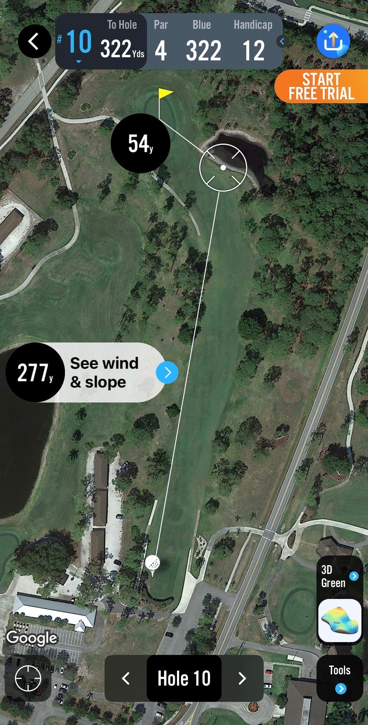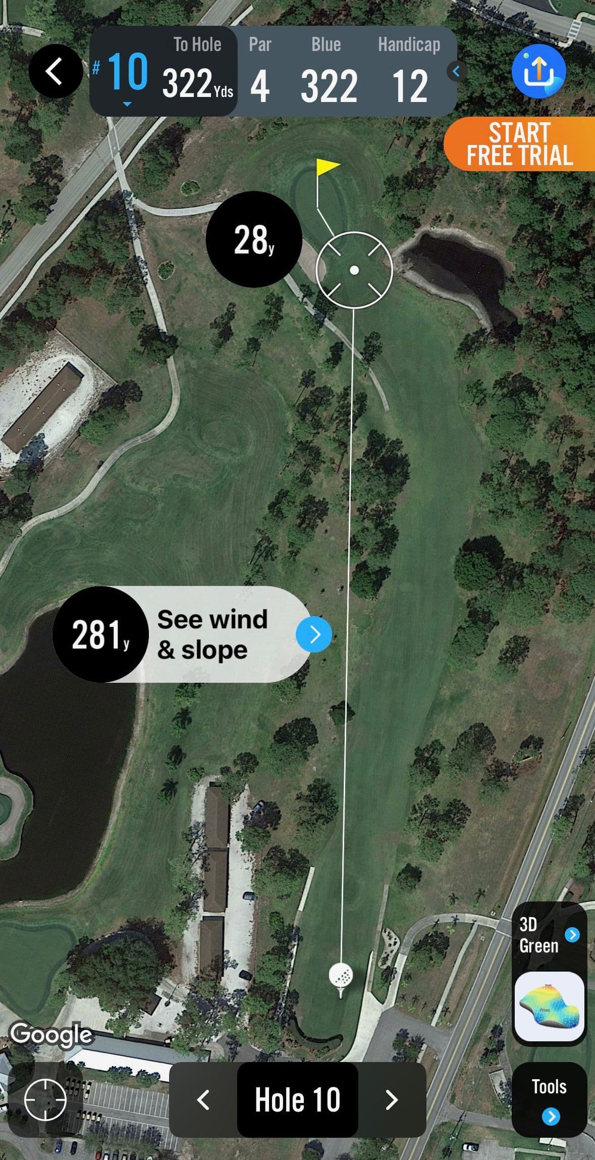 Adding to the complication was the angle of the incorrect tee. Although the tee was only a couple of paces ahead of the correct tee, the markers were placed on the right side of the dog-leg left creating a more accessible angle to the reachable green. The google earth images of the hole with both angles are below.