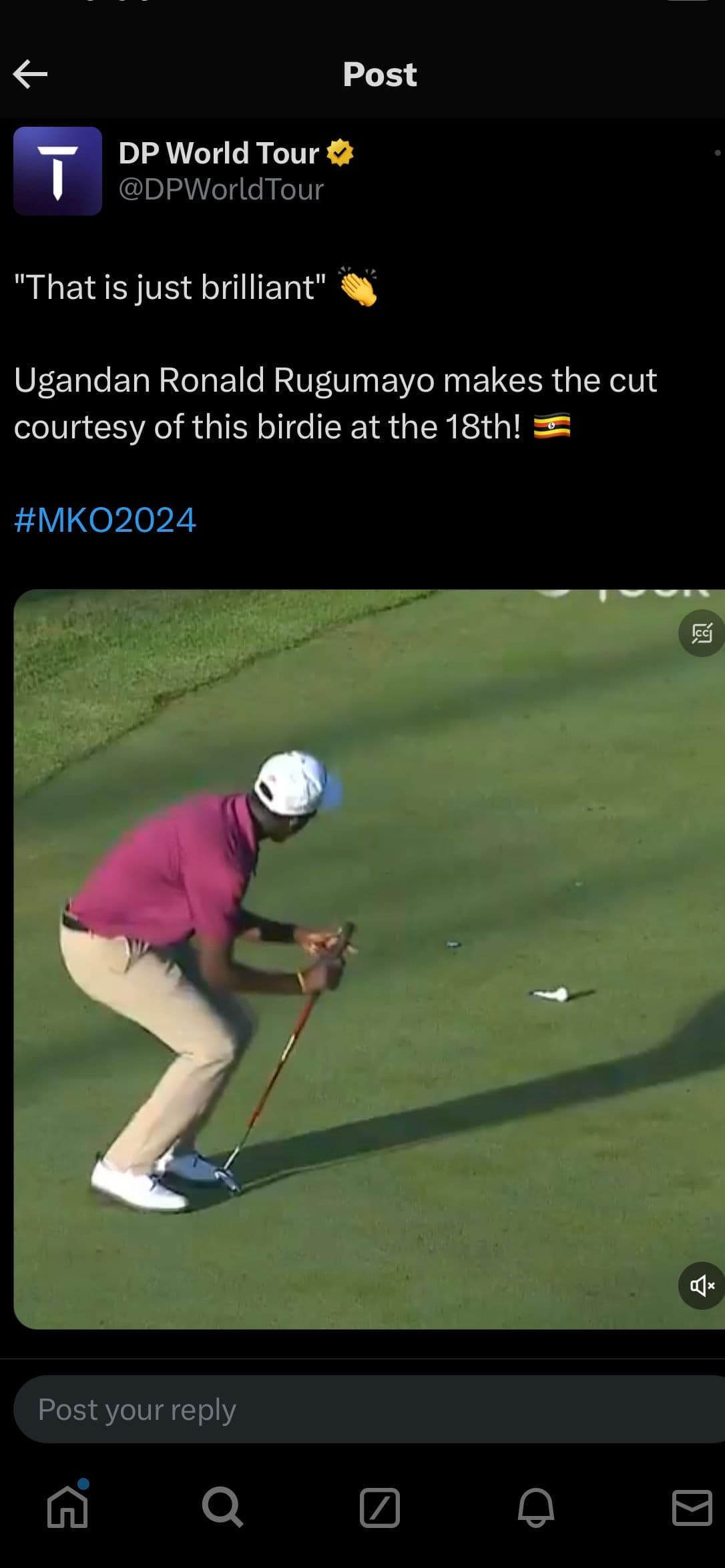 The claw grip Rugumayo used to hold his Odyssey putter produced a roll starting fractionally right of the hole, and turning ever so slightly; perhaps not enough. As the ball was within inches of the hole, Rugumayo crouched into a squat position and as the ball took one final revolution, Rugumayo’s hands came together on the grip as if he were saying a prayer. The ball fell in the right edge and the crowd erupted for the 31-year-old. Rugumayo became the first player from Uganda to ever make a cut on the DP World Tour. It was a triumphant moment. Magical even.